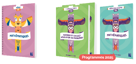 La méthode Totem mathématiques est proposée en deux fichiers (Nombres et calculs, Résolution de problèmes ; Espace et géométrie, Grandeurs et mesures) + un mémo de leçons (pour le CP et le CE1 : à spirale, peu encombrant sur la table). Elle accorde une large place à la manipulation et propose un apprentissage explicite et guidé vers l’abstraction, la compréhension, l’automatisation, la mémorisation, l’autonomie. Cette méthode propose notamment un enseignement poussé et inédit des gestes de base en géométrie, qui permettent aussi d’apprendre à travailler proprement et soigneusement.